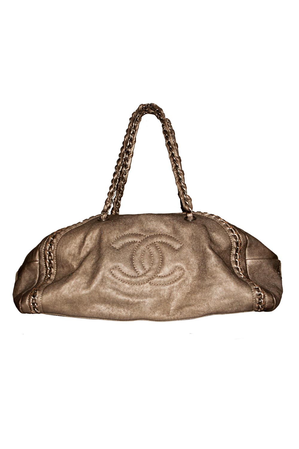 LARGE BOWLER BAG WITH CHAIN ACCENTS IN BRONZE METALLIC CALFSKIN