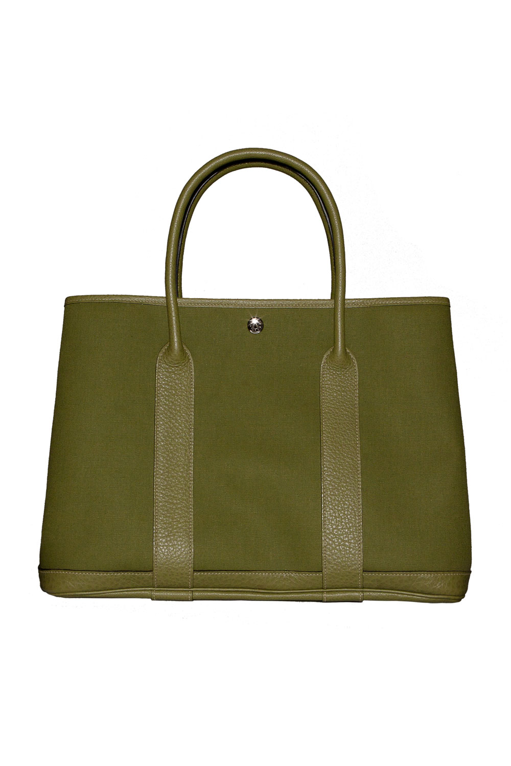 35CM TOTE IN GREEN CHEVRON CANVAS WITH GREEN BUFFALO SKIPPER LEATHER & SILVER PALLADIUM PLATED CLOU DE SELLE SNAP CLOSURE