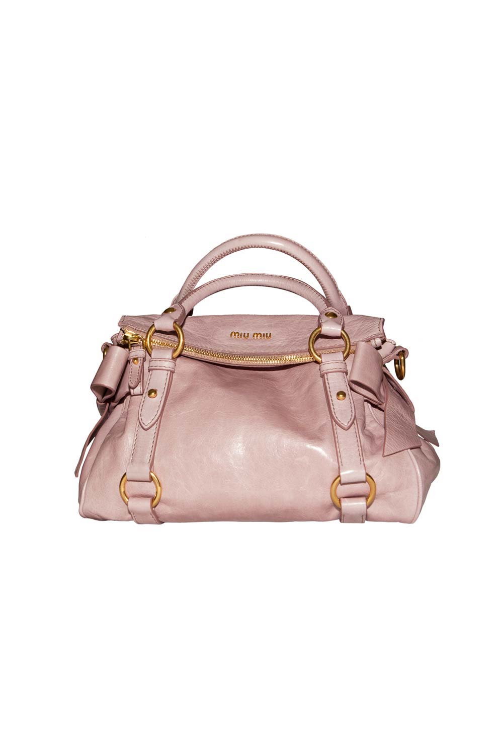 BOW-BEDECKED LEATHER TOTE IN PEARLIZED PINK. COMES WITH DETACHABLE STRAP