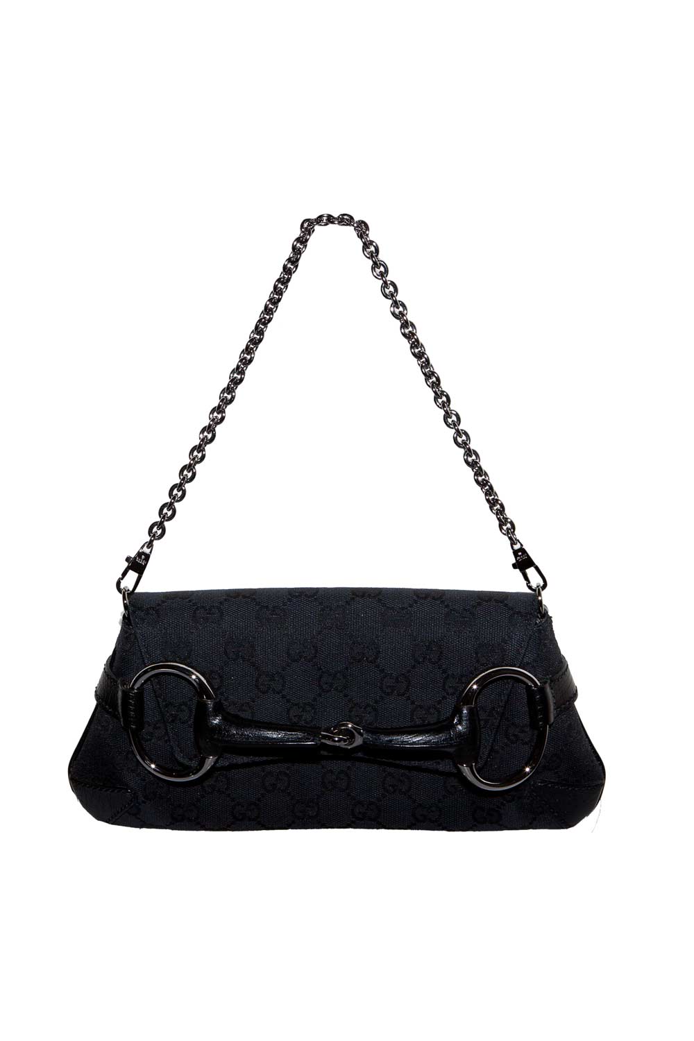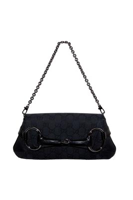 BLACK CLUTCH IN ORIGINAL GG FABRIC WITH BLACK LEATHER TRIMMINGS & DETACHABLE SILVER CHAIN