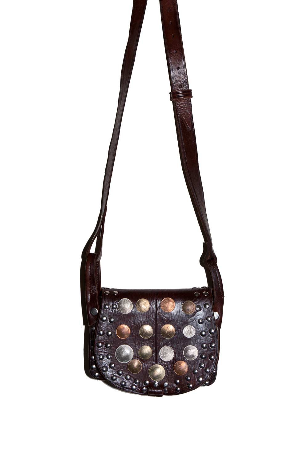 BROWN SLING BAG AFFIXED WITH VARIOUS EUROPEAN COINS