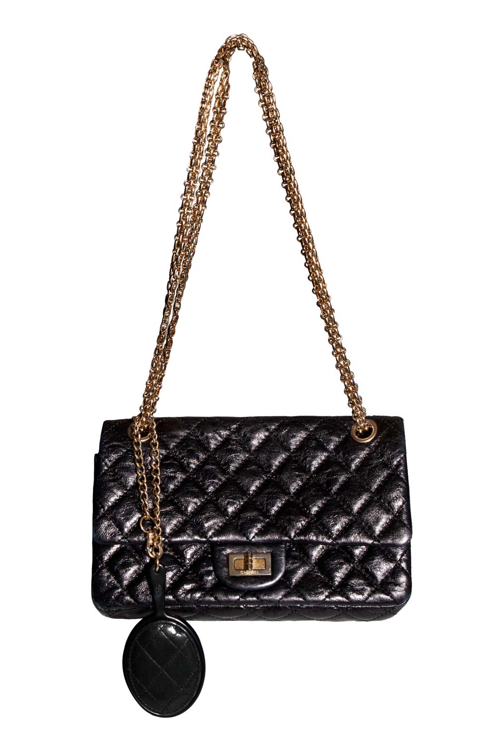 MEDIUM FLAP BAG WITH DOUBLE COMPARTMENTS IN BLACK METALLIC & GOLD HARDWARE