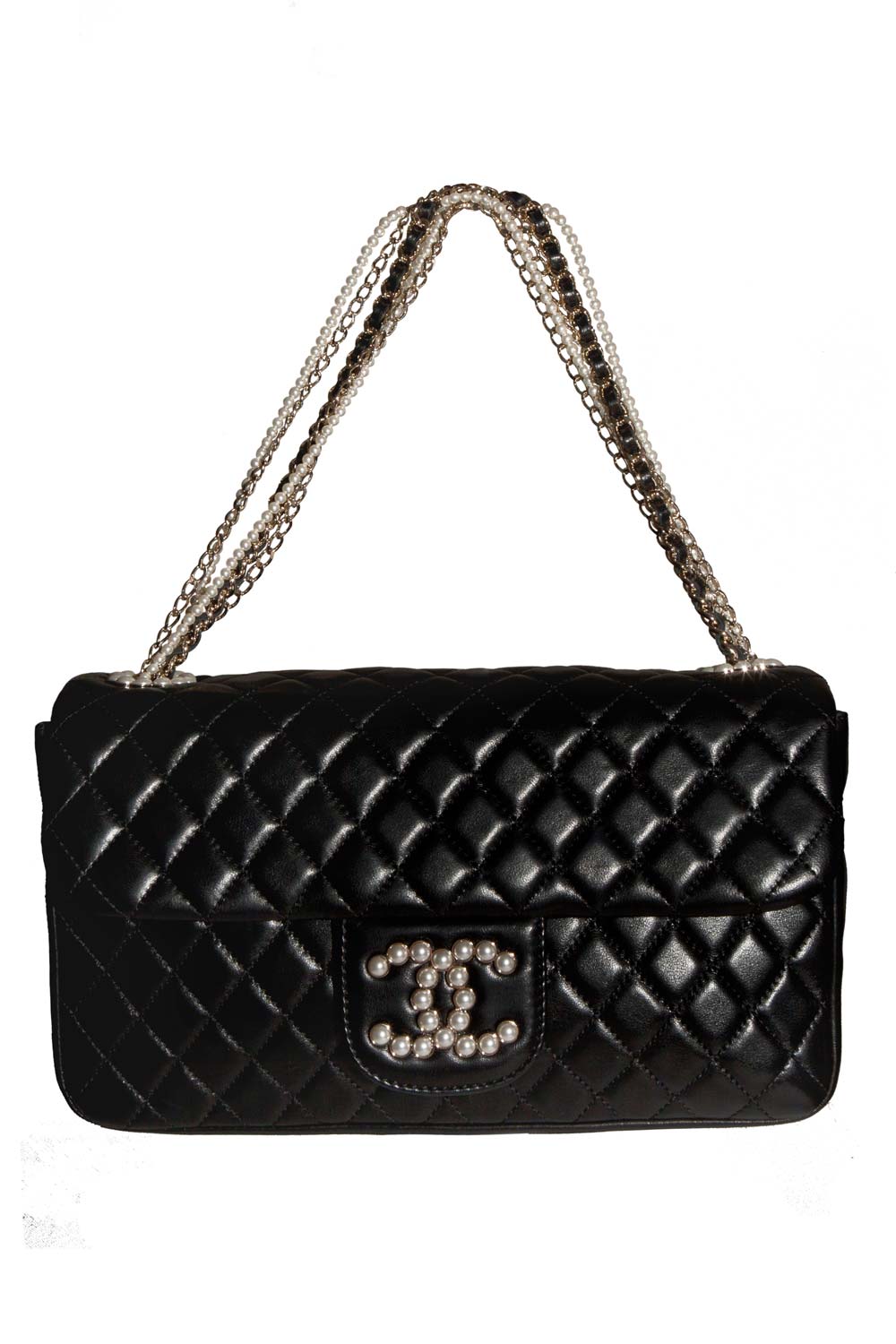 MEDIUM FLAP BAG IN BLACK LAMBSKIN WITH PEARLS & CHAINS