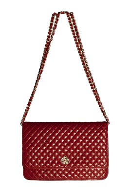 WALLET IN RED QUILTED LAMBSKIN & A LONG GOLD INTERLACED CHAIN