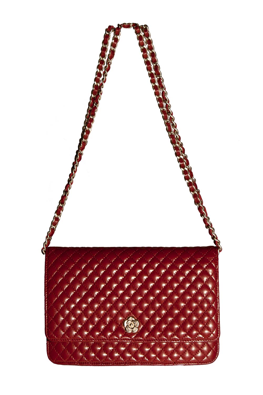 QUILTED WALLET ON CHAIN WITH GOLD CAMELLIA
