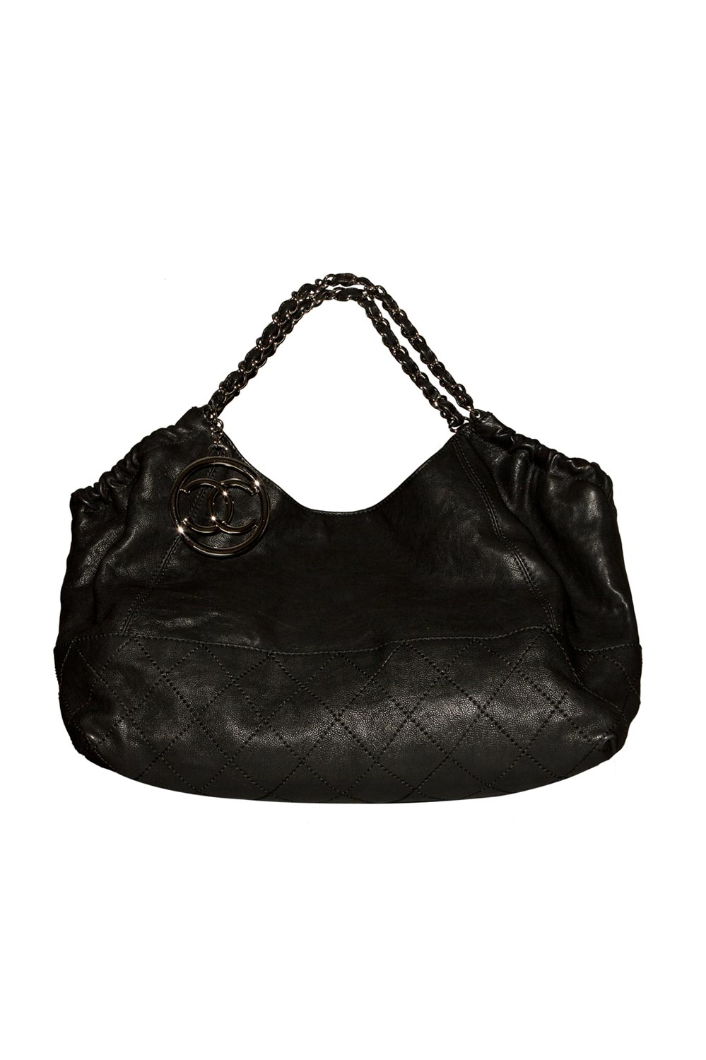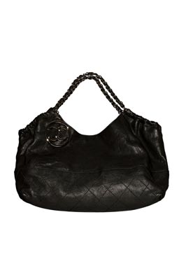LARGE TOTE IN BLACK CALFSKIN WITH SILVER “CC” LOGO CHARM. COMES WITH INTERIOR SATIN QUILTED POUCH