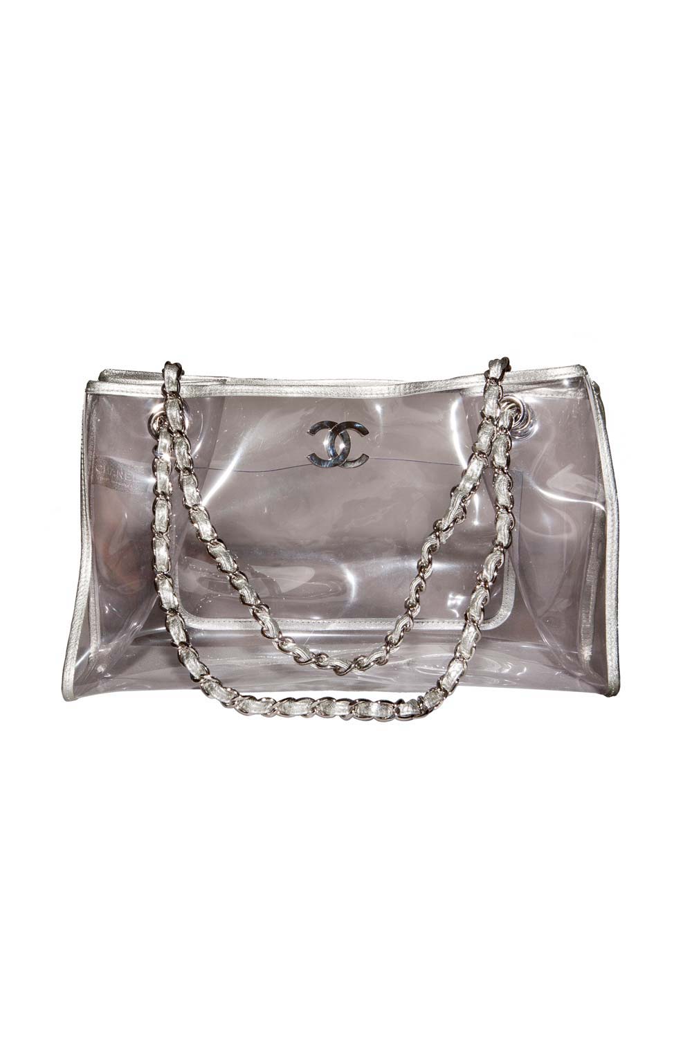 TRANSPARENT BAG IN PLASTIC WITH SILVER LEATHER TRIMMINGS & INTERLACED CHAIN